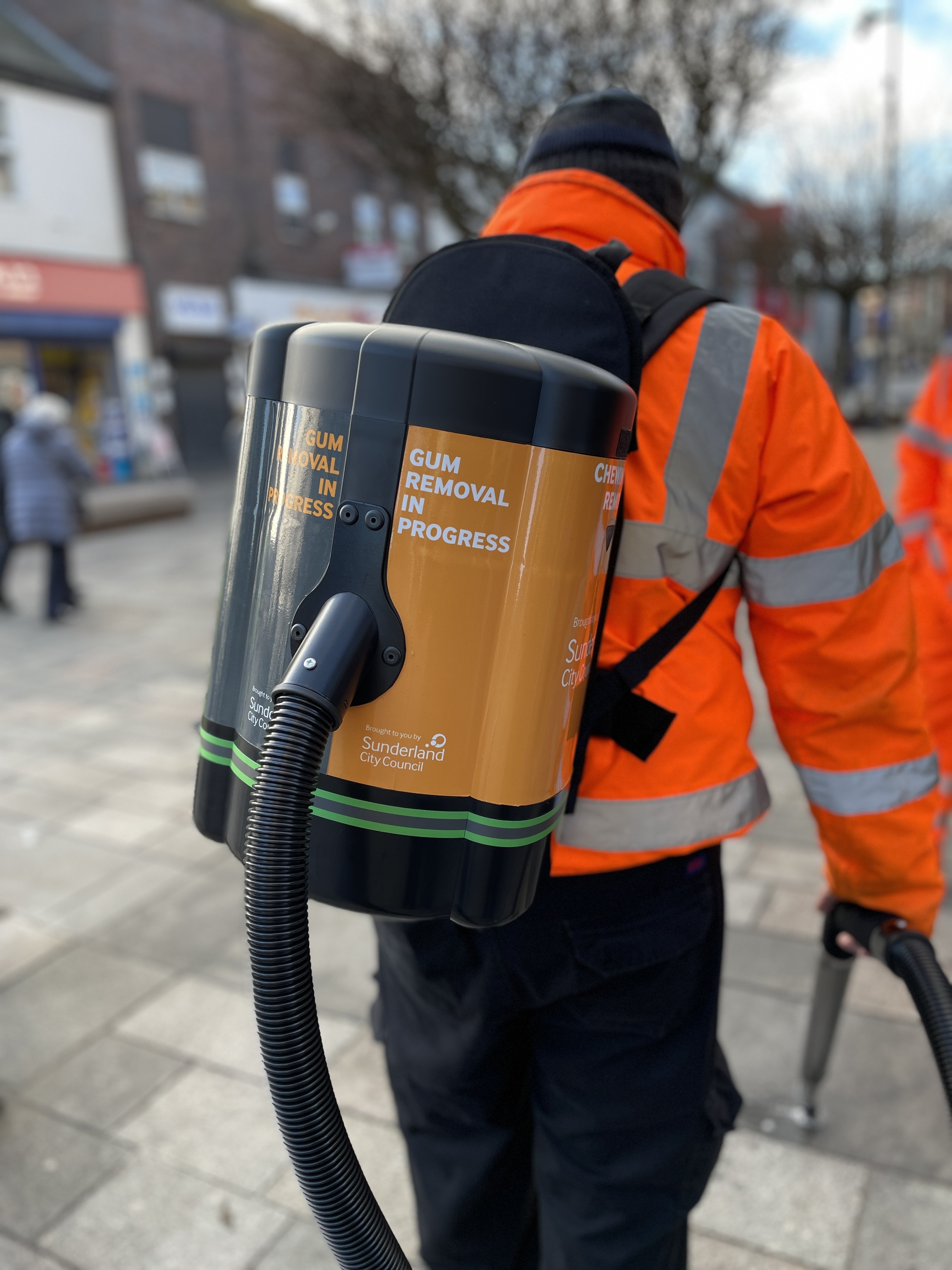 - No need to barrier off areas! – The Ecogum is fully portable, housed in a self-contained backpack allowing our operator complete freedom of movement to remove discarded gum from any area. There is no trailing leads causing no danger or disruption to the public, making it suitable when working in both populated and busy areas.
